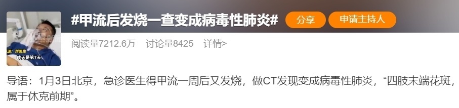 参加1月以来,寰宇各大病院呼吸说念感染患者比例激增,流感高发期禁闭驾临。除了孩子,不少成东说念主也接连中招。近日,北京一急诊医师在网上共享了我方感染甲流的经验。他提到,我方患甲流一周后,一霎高烧不退,全身发冷、喘憋,查验发现已发展成病毒性肺炎,伴有作为结尾花斑,属于休克前期。一时间,“甲流后发热一查酿成病毒性肺炎”的新闻登上微博热搜,再次激发了东说念主们对甲流的担忧。