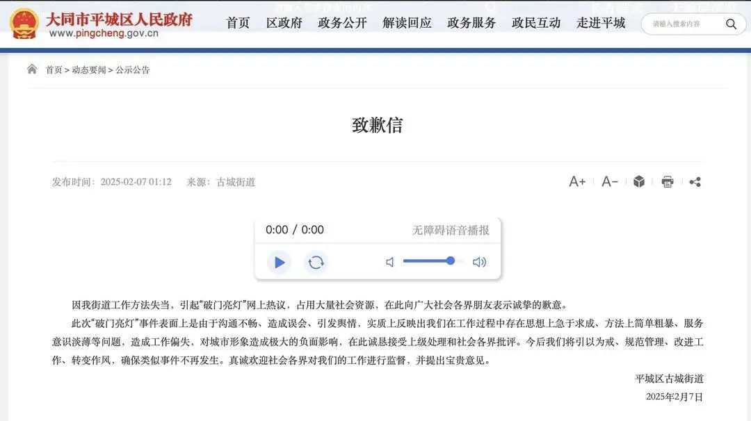 2月7日,山西大同平城区古城街谈就“破门亮灯”步履谈歉。称因责任方法失当,形成责任偏失,激发舆情,今后将引以为戒。