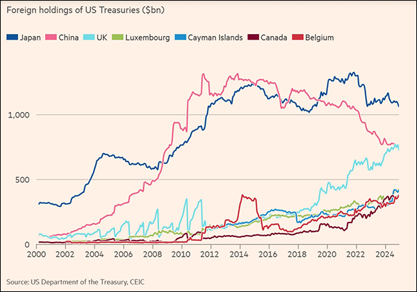 与征收抨击性关税比较,抛售债券对经济增长的影响较小。那些遭到关税打击的国度不应该络续为好意思国的财政赤字出钱。
