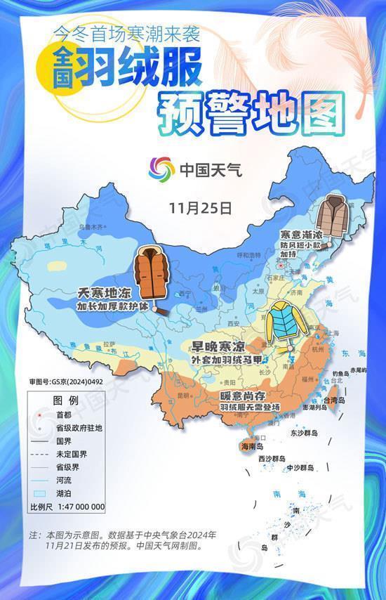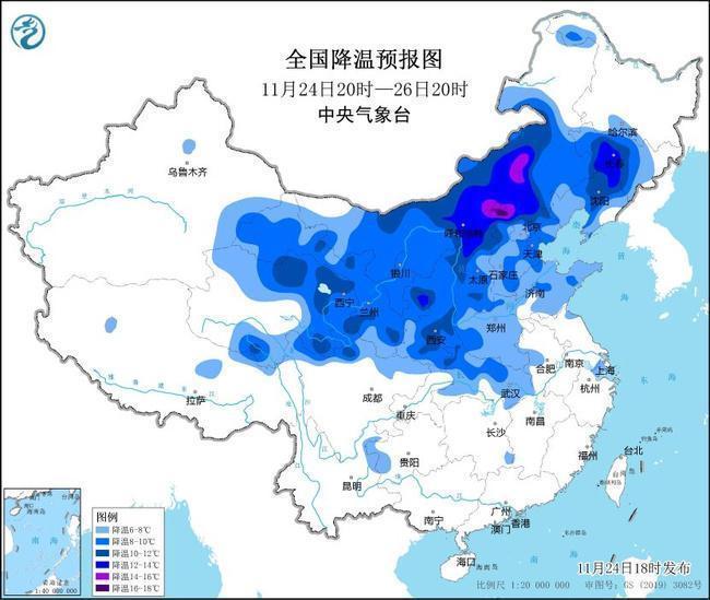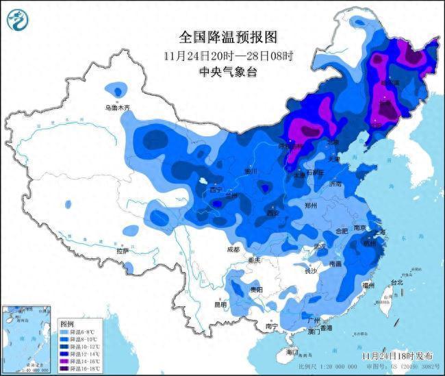 11月24日20时至11月28日08时,我国大部地区气温将先后下落6~10℃,其中,华北北部、内蒙古及东北地区等地部分地区降温12~14℃,局地16℃以上。28日前后,最低气温0℃线将南压至苏皖北部至河南南部一带,其中,大别山、黄山等高海拔山区最低气温也将低于0℃。瞻望,11月24日20时至11月26日20时,西北地区、内蒙古大部、华北、东北地区中南部、黄淮、江淮西部、江汉等地将先后降温6~10℃,其中,内蒙古中部、华北北部、东北地区中南部等地部分地区降温可达12℃以上。